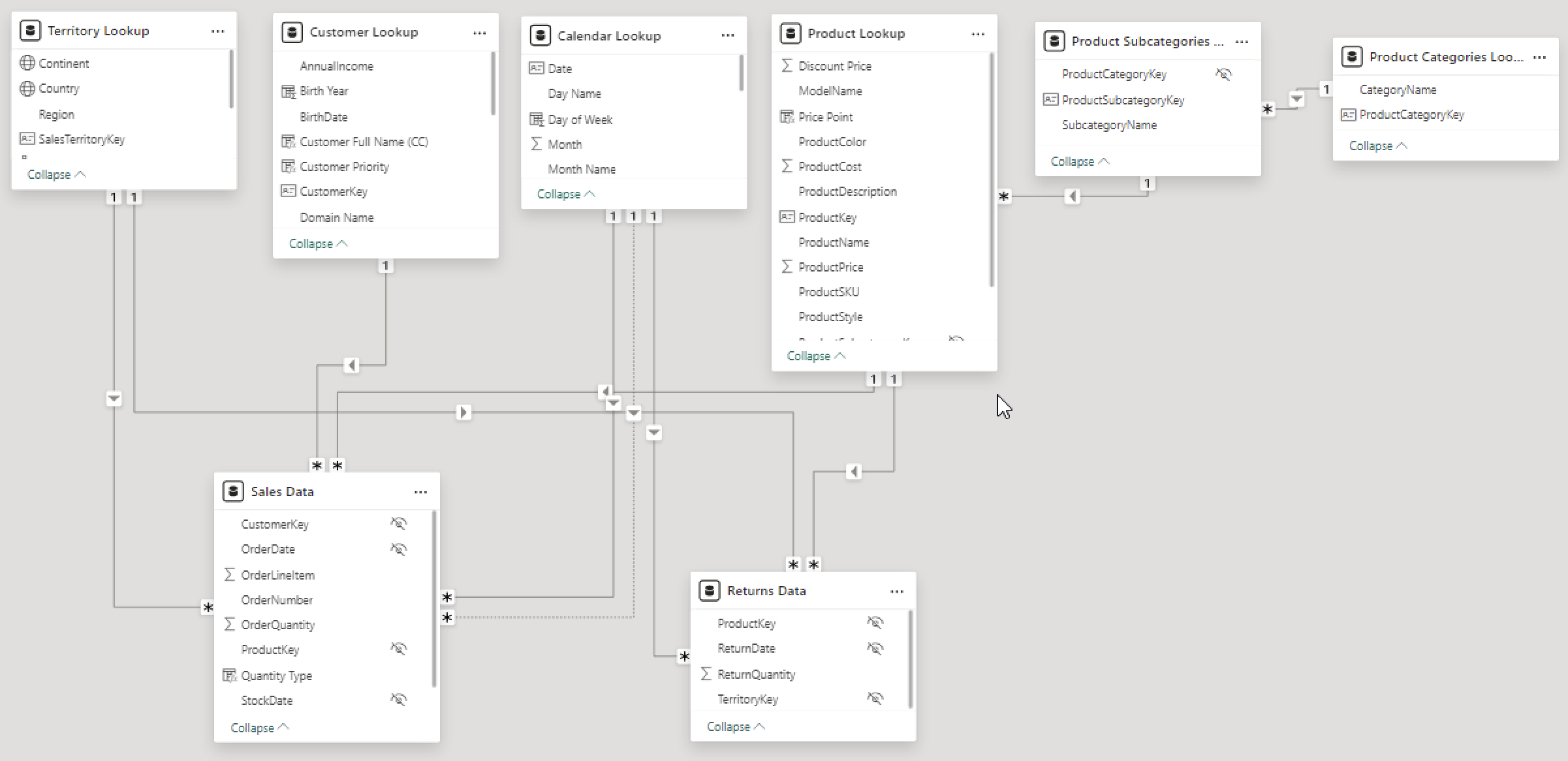 Enabling active or inactive relationships, creating hierarchies for fields such as Geography (Continent-Country-Region) and Date (Start of Year-Start of Month-Start of Week-Date), and finally hiding the foreign keys from report view to ease the data analysis and visualization steps and reduce errors.