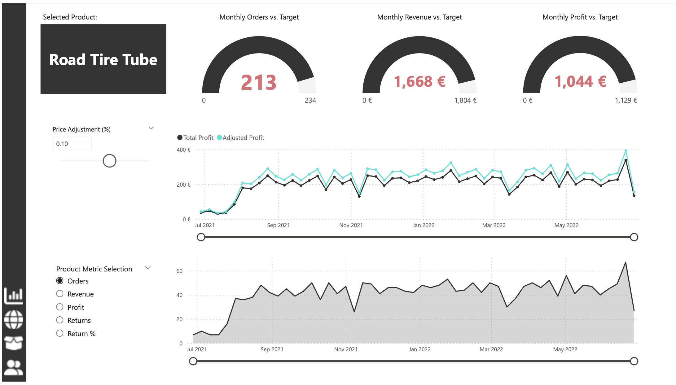 Product Detail: The third report page focuses on detailed product-level analysis. It displayed detailed product information for the selected top 10 products from the Executive Dashboard, using the drill-through feature. It also included gauge charts presenting actual performance vs target performance of monthly orders, revenue, and profit, and included an interactive line chart to visualize potential profit adjustments when manipulating the price of the product, aiding in strategic decision-making regarding pricing strategies. This report page also included a line chart including key weekly product information on total orders, revenue, profit, returns, and return rate.